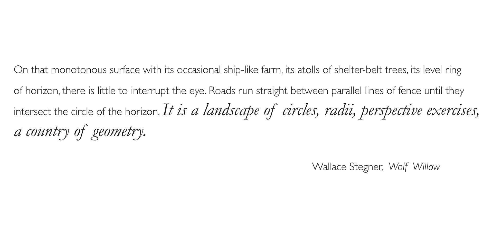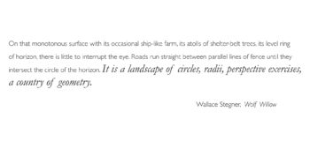 This suite of prints reflects my response to distinct and resonant descriptions of the North American landscape chosen from the works of seven iconic authors. Great writers have always had the power to convey a sense of place through vivid and compelling narrative. As a reader, I have explored these places, both familiar and unknown, through the force and beauty of the writer’s words. As an artist, I have taken their words as a point of departure, a catalyst to a visual response. While the words evoke a detailed sensory awareness of a particular place, the images search for its essence through minimal forms that trace the geometry of the land.