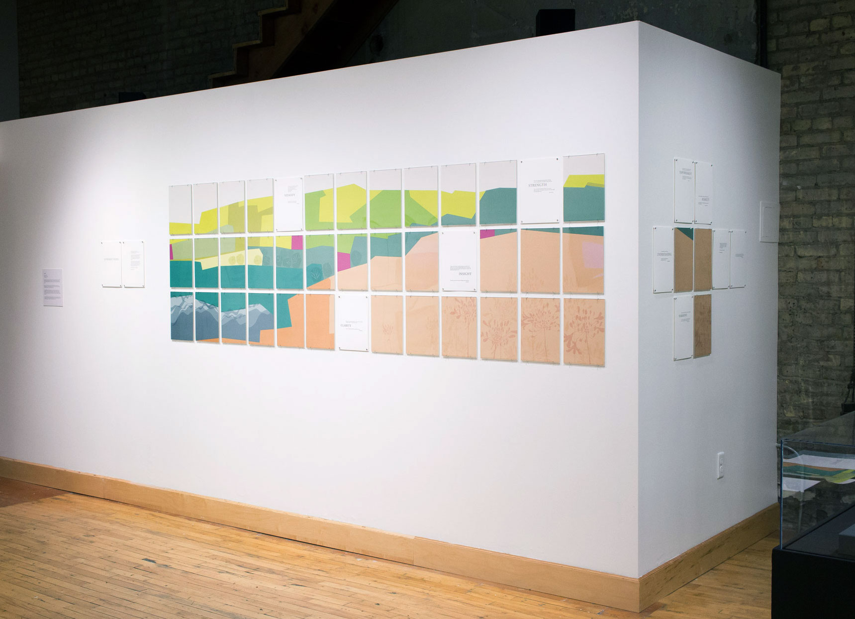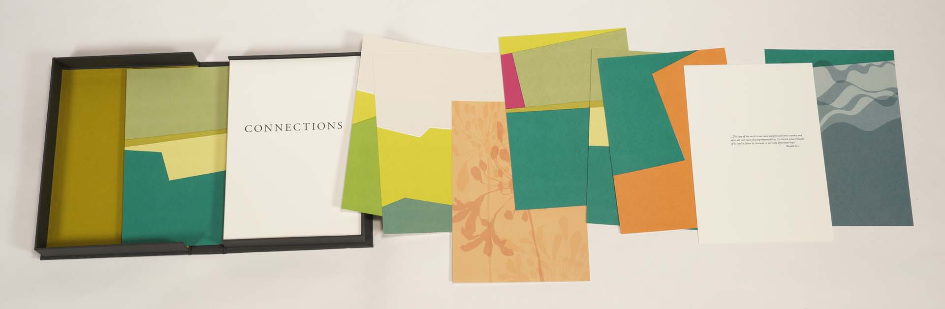 The physical book, the way it’s put together as a box of unbound pages, is about engagement. The reader could arrange the pages in any number if ways, but all arrangements require connecting one page to another. And when they are connected in a particular way, they form a panoramic landscape image, a visual metaphor for what we can find when we make a connection.