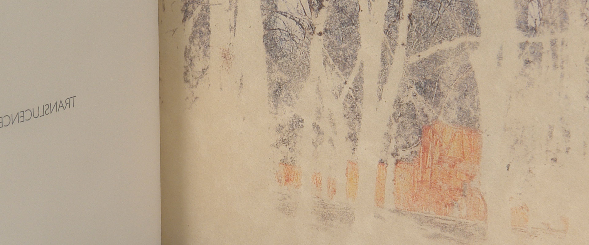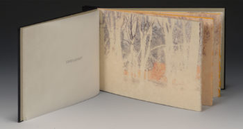 Color Xerox image transfer on handmade Japanese paper, digital text on vellum, stab binding; covers are Japanese bookcloth over bookboard.